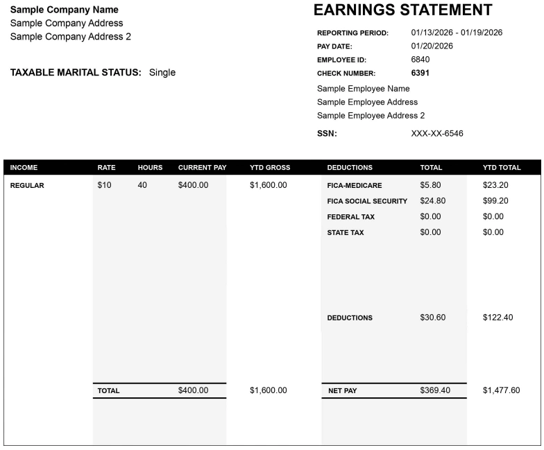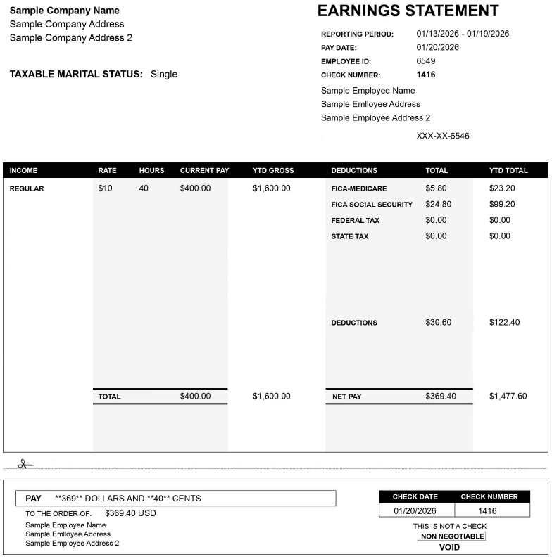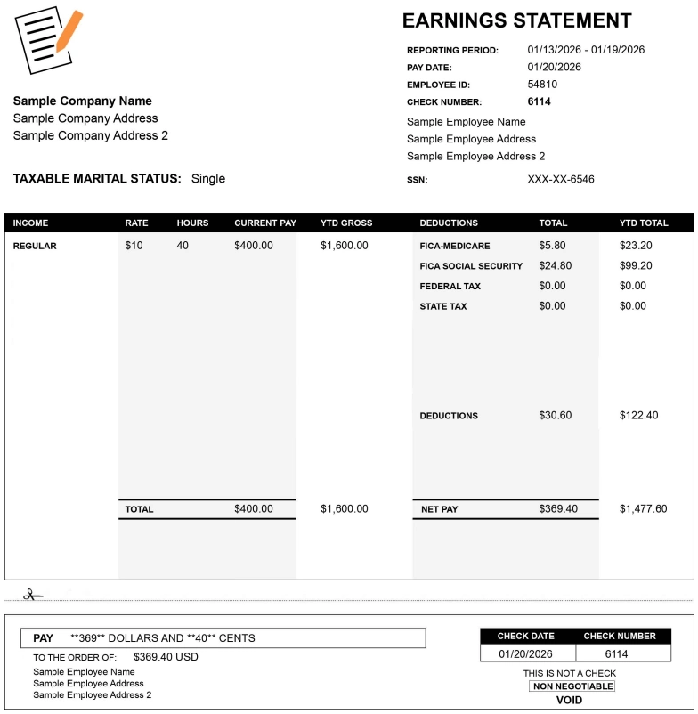 Create an advanced paycheck stub designed for complex needs, featuring expanded rows. This template includes a comprehensive summary section for a deep dive into Year-To-Date totals, along with the option to download a direct deposit slip and integrate your company logo for a professional, branded appearance.