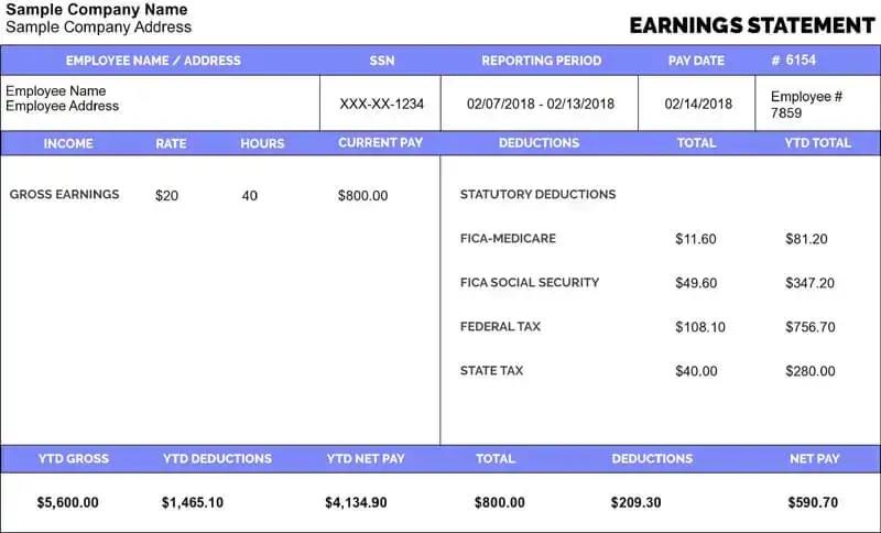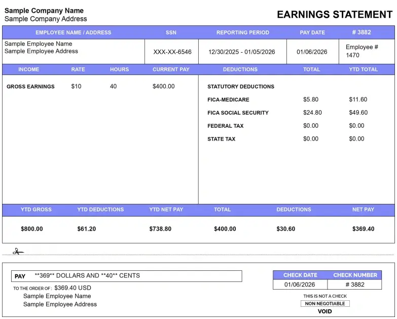 Do you require a detailed check stub that offers a refined look with distinct sections? This clean, white and lavender layout ensures that even complex payroll information remains easy to scan. This template is ideal for companies that prioritize transparency and thorough breakdowns.