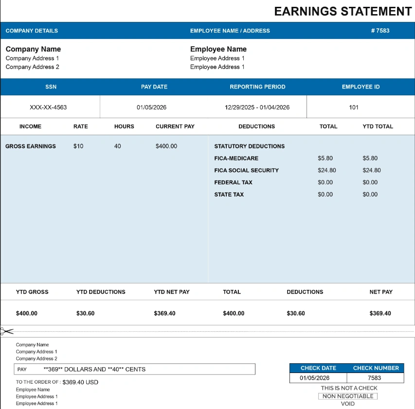 Deliver a modern paystub that uses a horizontal orientation to differentiate between various income types. The Modern Ocean design is widely considered our most visually stunning template for digital distribution. Provide your workforce with a creative layout that simplifies financial record-keeping and tax tracking.