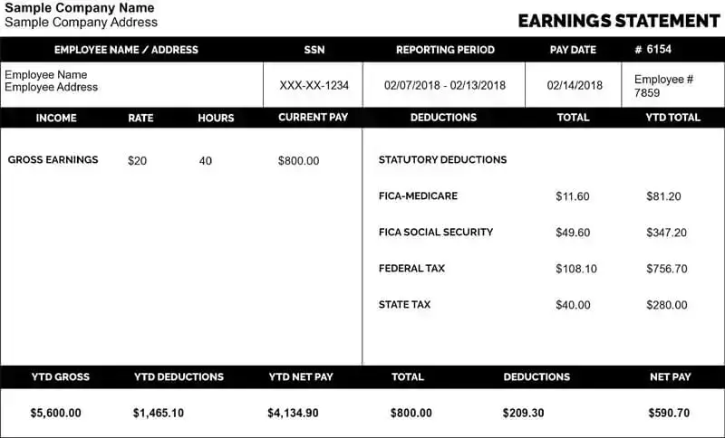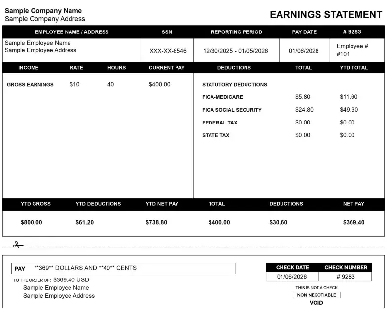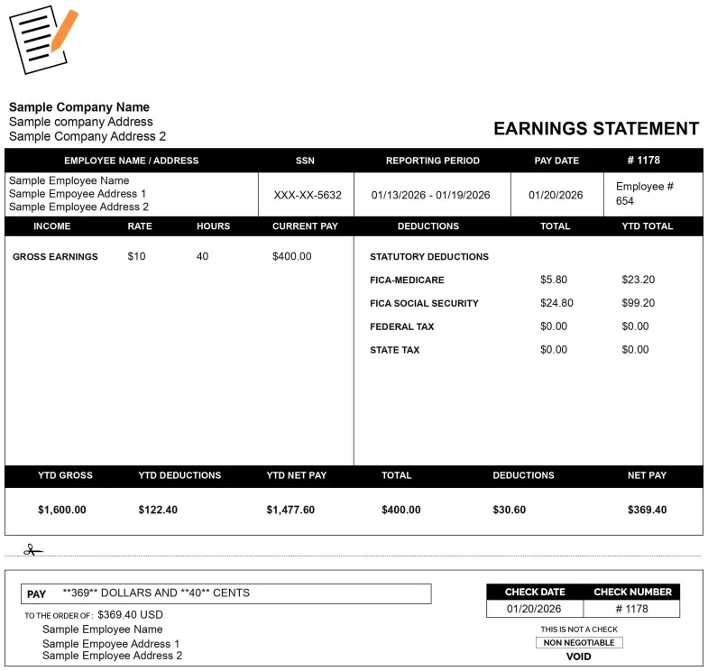 Design an efficient paystub with a compact layout that fits all essential details. This template features high-contrast sections to separate employee info from financial data clearly. It is best suited for small businesses needing a high-quality look without unnecessary complexity.