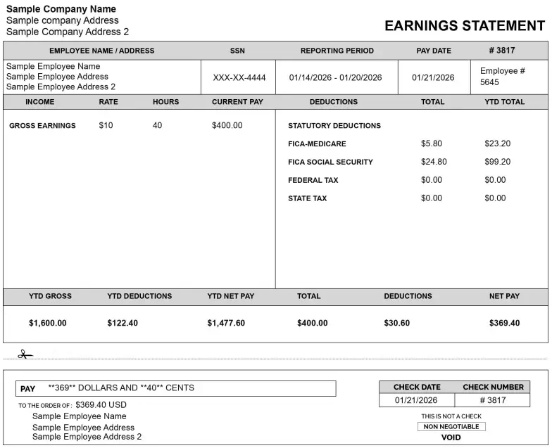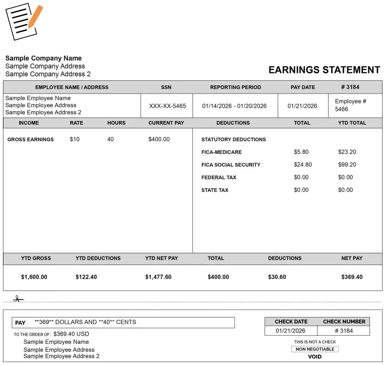 Looking for a standard pay stub with a professional layout? This paystub design organizes employer details and employee summaries in a clean, basic format. It is the perfect choice for a reliable, no-frills layout that covers all basic payroll requirements.